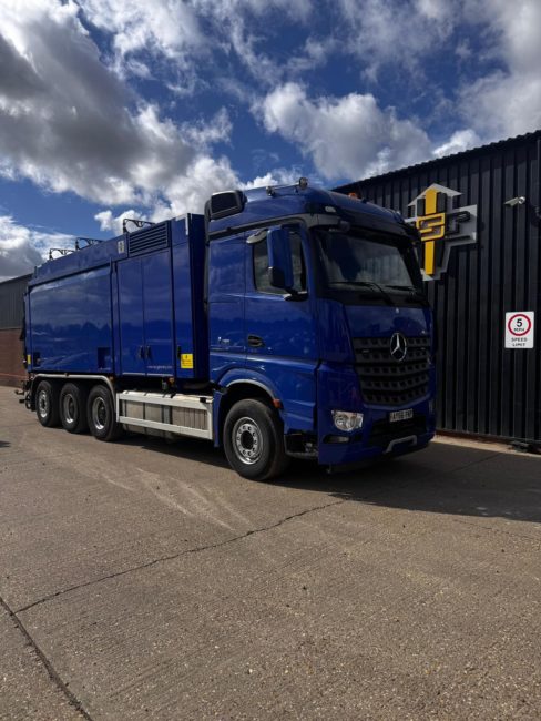 - Chassis Configuration: Arocs 5 3251LK 8x4x4, right-hand drive, including MirrorCam, audible left turn warning with side scanners, 4 way camera system with DVR recording, 1.2 metre LED roof mounted blaze bar